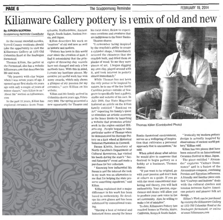 While Thomas has not been the only potter to be inspired by nature, he is one of the few North Carolina potters outside of Seagrove to specifically host a gallery, studio, and website of his own. In July 2009, Our State Magazine featured an article on the Kilian family entitled "Banking on Art," reporting his family's quest to stimulate an artistic economy in the Inner Banks by launching a website that promotes artists' work in the region entitled IBXarts.org. People began to notice Thomas when he demonstrated his Heritage Pottery on a kick wheel at Historical Somerset Plantation in Creswell.