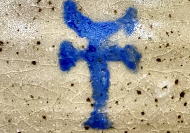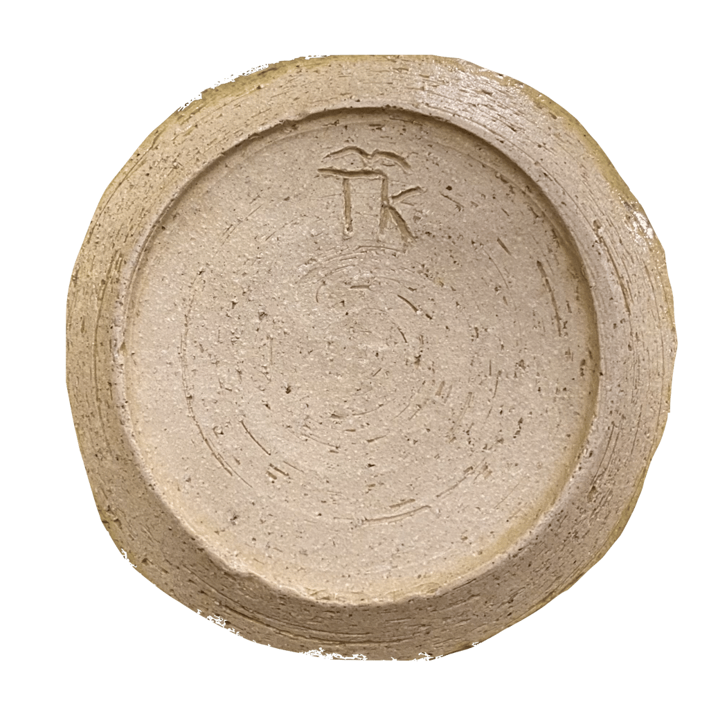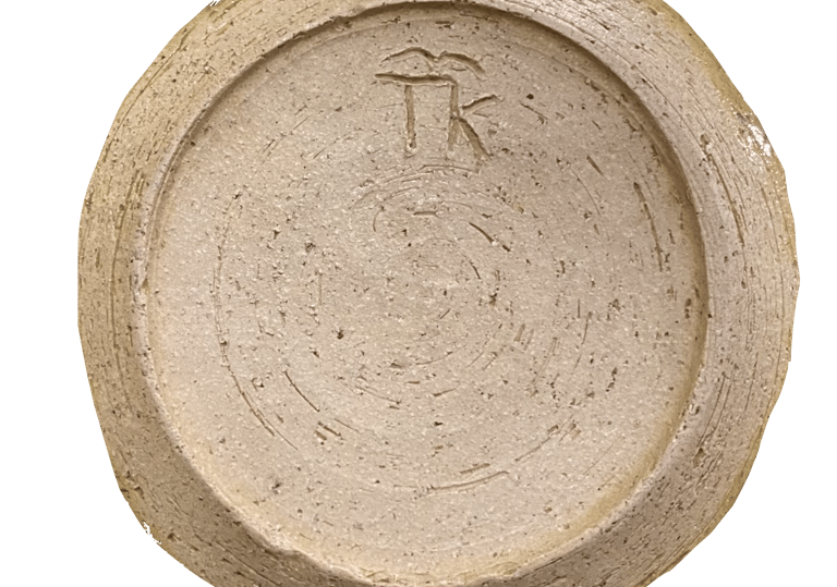 Maker's mark is a ligature of 'T' and 'K', which is hand-painted in cobalt blue glaze. The mark is found on the exterior of the pot towards the bottom or belly of the pot. Year inscribed on the bottom of the pot with a two-digit year code, and sometimes with the number of the pot thrown that year. These wares were made with manganese stoneware. Pottery with this mark are coveted by collectors because of the novelty of the stamp and the wares that bore them. Even more so, these works were the first to be purchased nationally and also represent a transformation of style at the pottery.